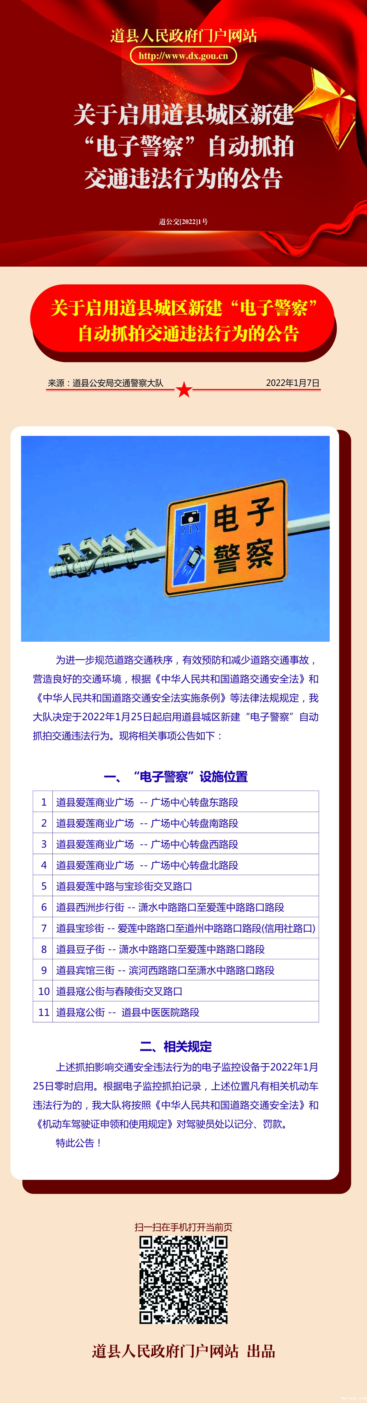 关于启用道县城区新建“电子警察”自动抓拍交通违法行为的公告