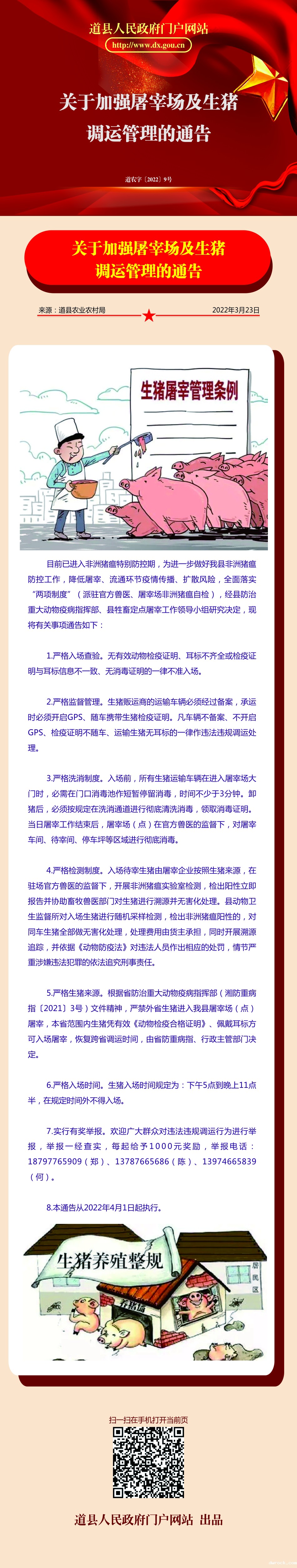 道县农业农村局关于《加强屠宰场及生猪调运管理的通告(道农字2022)》的政策解读