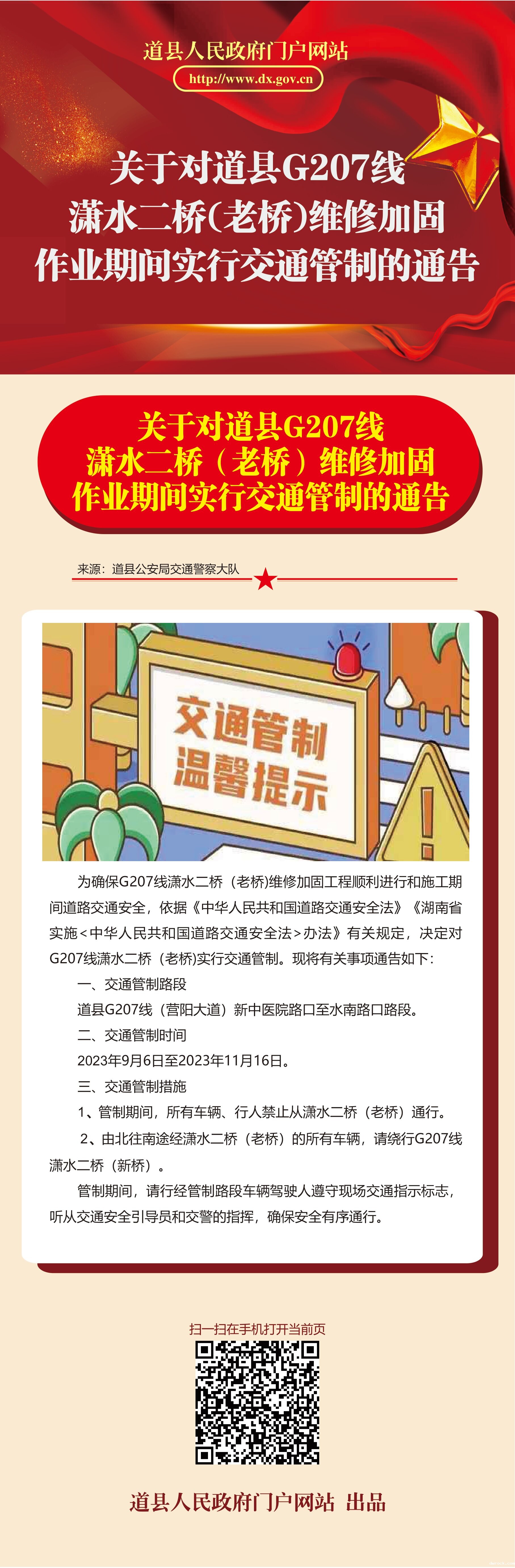 道县公安局交警大队关于《关于对道县G207线潇水二桥(老桥)维修加固作业期间实行交通管制的通告》的政策解读