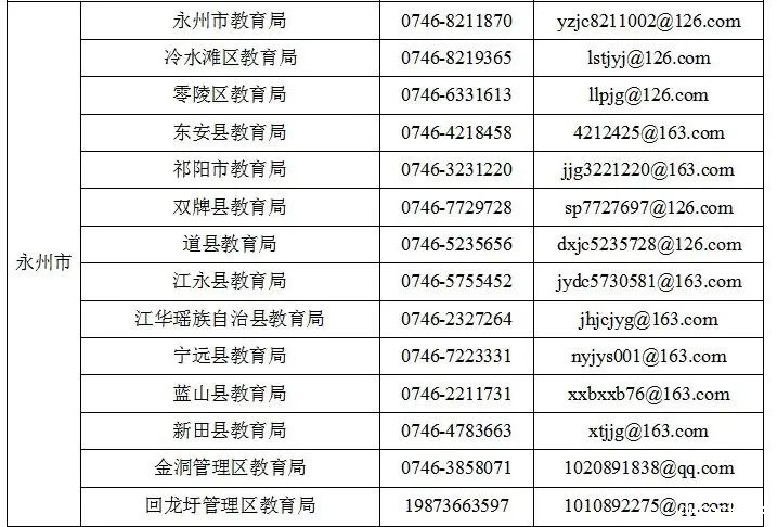 永州市各县市区(管理区)教育行政部门中小学办学行为监督电话及联系人